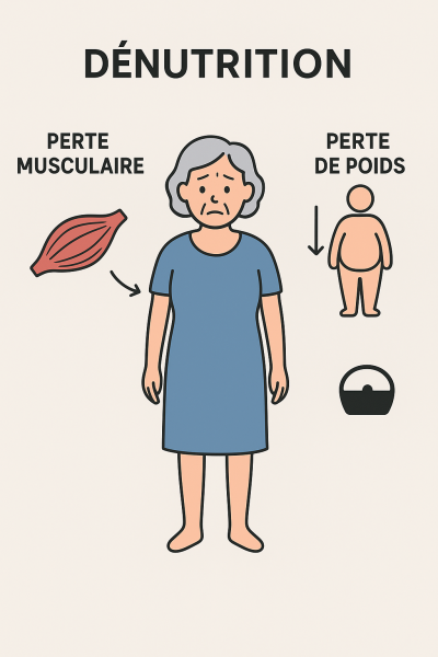 La dénutrition est un déséquilibre entre les apports nutritionnels et les besoins de l’organisme, entraînant une perte de poids et une altération de la masse musculaire. Les personnes âgées y sont particulièrement sensibles. En effet, le vieillissement s’accompagne de nombreux facteurs qui favorisent la dénutrition :
