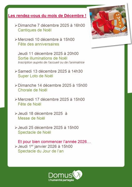 Pour accompagner nos résidents tout au long des fêtes, nous avons prévu une programmation riche : spectacles, super loto en compagnie des familles et des proches, sortie pour admirer les illuminations parisiennes, chorales bénévoles... sans oublier la venue du Père Noël.