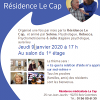 Publiée le 17/12/2019Le jeudi 9 janvier 2020 aura lieu notre premier café rencontre de l'année. Le thème sera "Ce que la relation d'aide m'a appris sur moi-même" Nous vous attendons nombreux Lire la suite