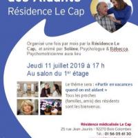 Publiée le 23/07/2019Le 11 juillet a eu lieu le dernier café rencontre avant l'été. Le thème portait sur: "Partir en vacances quand on est aidant". Ce fut l'occasion d'aborder la culpabilité que peuvent rencontrer les aidants lors de leur départ en vacances. Rendez-vous le 19 septembre à 17h au salon du 1 [...] Lire la suite